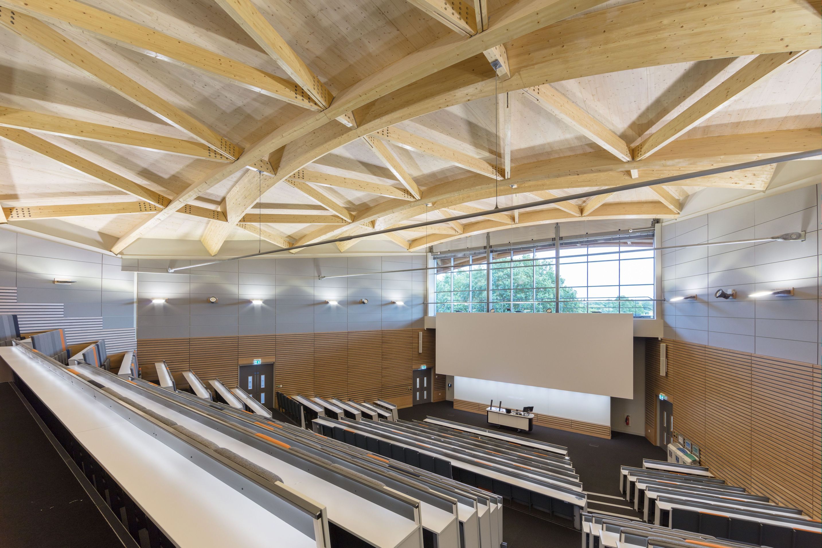 “I really like the glulam ceiling and the use of glass throughout the building, which helps highlight the green space we have on campus. From a technical point of view, I’m really excited about the use of edge blended projection in the large lecture theatres, which allows lecturers to easily configure a huge digital canvas, to display a multitude of content.”
